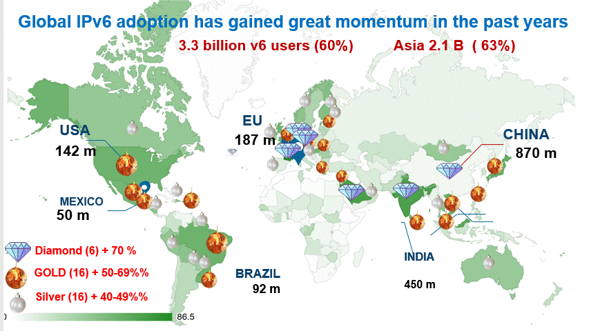 This is a recognition for his long term outstanding investment efforts by engaging the Chinese government to deploy IPv6 in Large scale which made China number one IPv6 adopter with over 800 Million IPv6 users. |